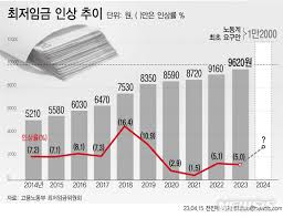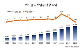 최근 5년간 최저임금과 전년대비 인상률을 보면 2019년 8350원(10.9%), 2020년 8590원(2.87%), 2021년 8720원(1.5%), 9160원 2022년에는 5.05%, 올해는 9620원이다. (5.0%).