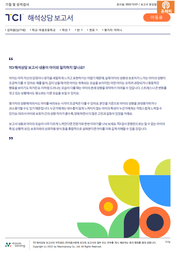 해석 순서는 1입니다. Wexler Intelligence Test (K-WISC-V) 2. JTCI (성격 및 아동 기질 자녀의 경우) 3. 분열 모양의 육체 시험 (PAT-2)